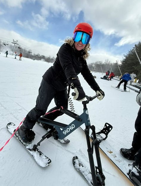 On the weekends, I help run and instruct at Blue Ridge Adaptive Snow Sports at Liberty Mountain Resort, where we use a variety of adaptive products, tools, and techniques to help people of all abilities enjoy snow sports. But hands down, my favorite is the SNO-GO Ski Bike. This innovative ski bike not only makes snow sports more accessible but it's genuinely the coolest thing on the slopes! Just like Zippy's cane, it's a massive conversation starter. Everyone on the mountain wants to know about it, try it, or snap a photo it's fun, intuitive (like riding a bike on snow), and brings pure joy and freedom to the experience to people who otherwise might not be able to enjoy snow sports.