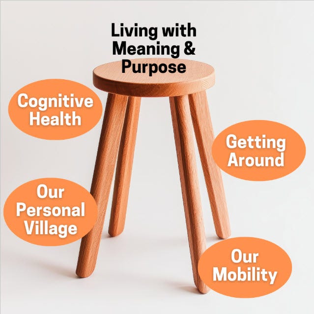 This experience inspired the "four-legged stool" metaphor—a simple, powerful framework for purposeful aging. Each leg represents a pillar of well-being: Cognitive Health, Getting Around, Our Personal Village, and Our Mobility. Like a sturdy stool, balance depends on all four legs. If one falters, stability is at risk, but with foresight, each can be strengthened.